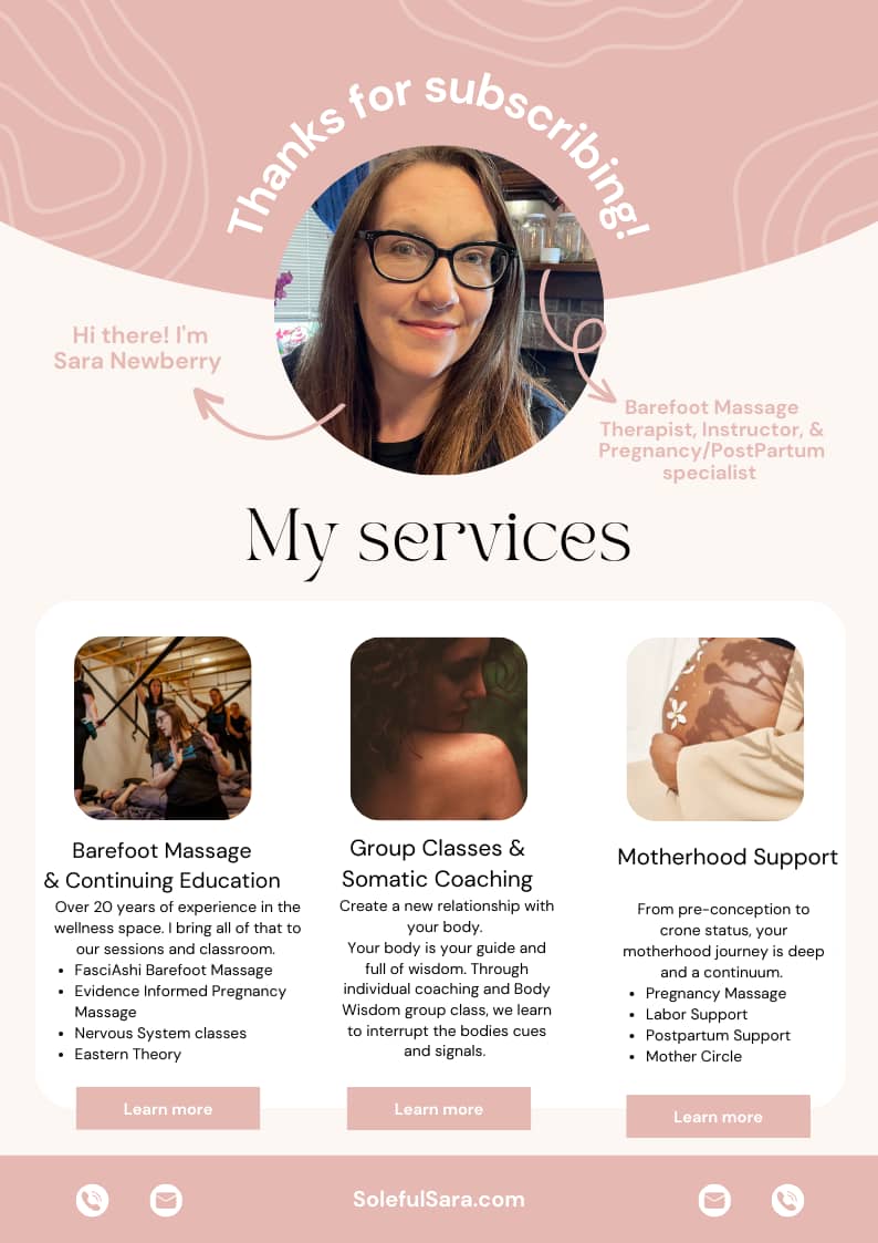 Sara Newberry is a devoted bodyworker, mother, and founder of Somatic Sole Massage in St. Louis, MO, where she blends ancient wisdom with modern nervous system science to support holistic well-being. Specializing in Mind Body Coaching—a bottom-up approach that centers the body’s intelligence rather than the mind’s agenda—Sara offers a deeply intuitive, trauma-informed space for healing and transformation. Through barefoot massage, somatic practices, and sacred motherhood care, she guides clients in reconnecting with their body’s natural rhythms and resilience.